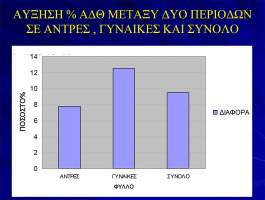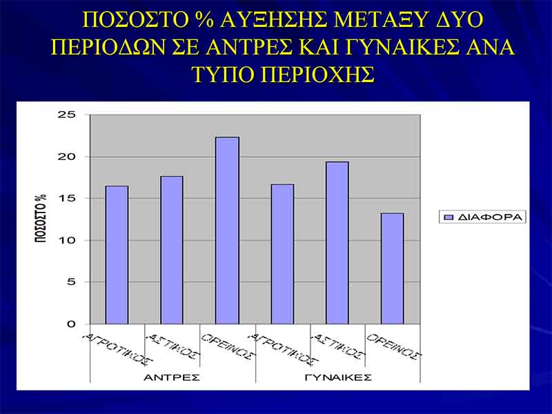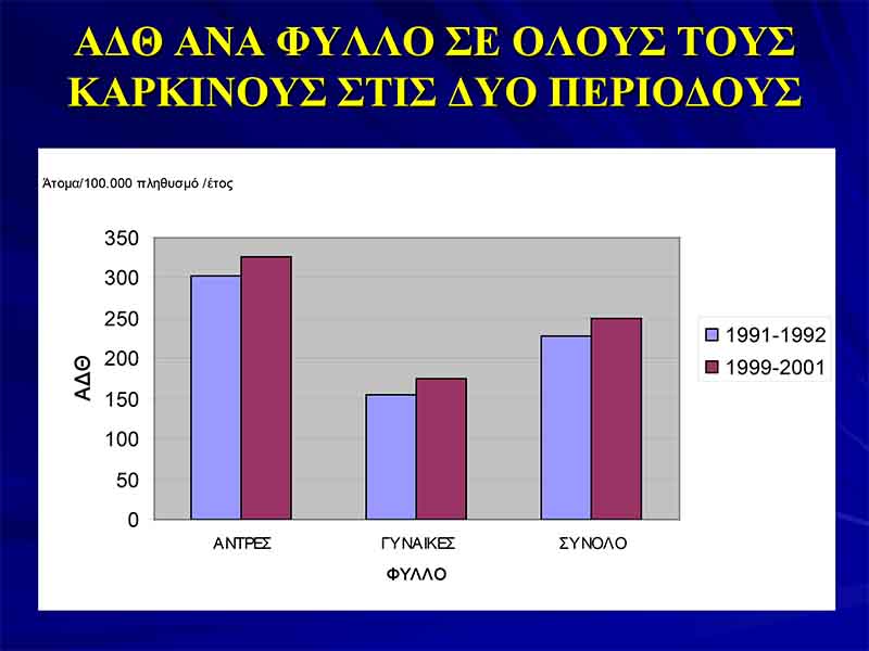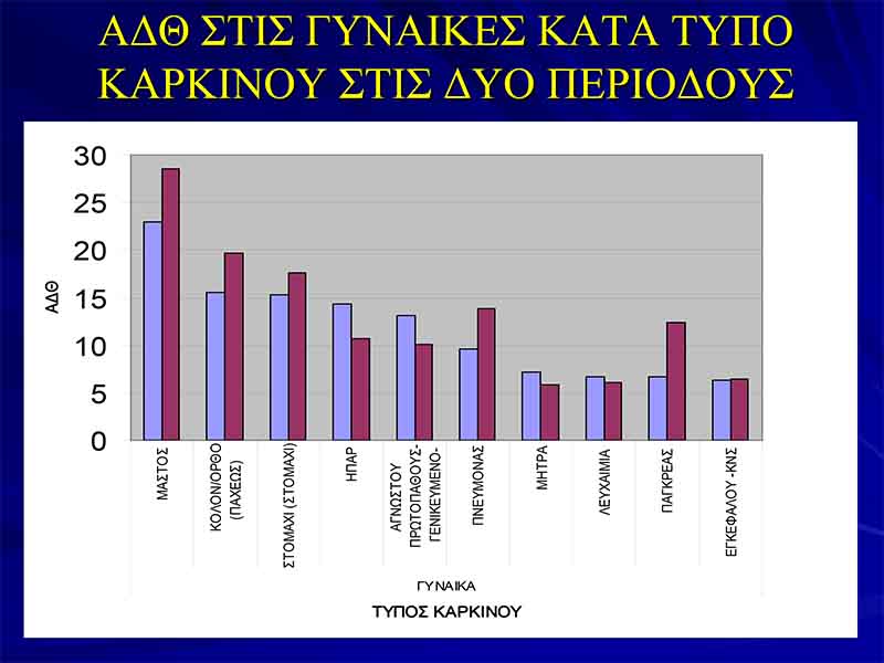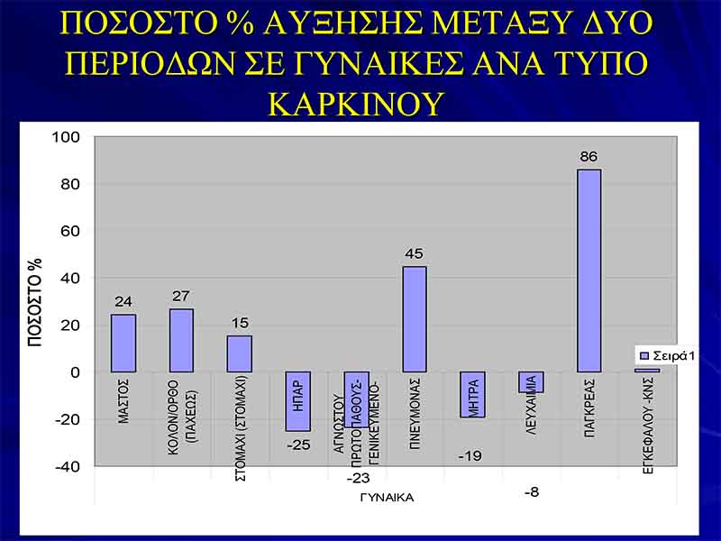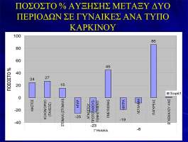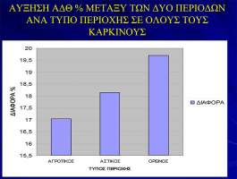 4. Η πρώτη νεοπλασία σε αύξηση του ποσοστού της στους άνδρες είναι αυτή του παχέως εντέρου με δεύτερη αυτή της ουροδόχου κύστεως και τρίτη αυτή του πνεύμονος. Στις γυναίκες η πρώτη νεοπλασία σε αύξηση του ποσοστού της είναι αυτή του παχέως εντέρου, δεύτερη αυτή του παγκρέατος και τρίτη αυτή του μαστού. Ομοιότητες αυξήσεων παρατηρήθηκαν σε κάθε τύπο περιοχής.