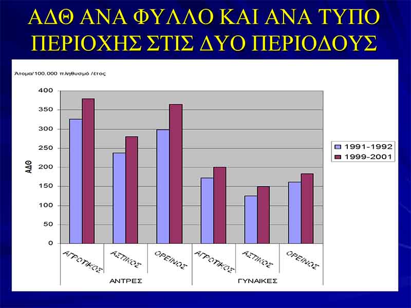 1. Μεγαλύτερη θνησιμότητα στις αγροτικές περιοχές που ακολουθείται από τις ορεινές και τελευταίες τις αστικές δηλαδή η αγροτική είναι 38% παραπάνω από την αστική και η ορεινή είναι 28% παραπάνω από την αστική για το 1991-92. Ενώ για το 1999-2001 η αγροτική είναι 37% παραπάνω από την αστική και η ορεινή 30% παραπάνω από την αστική.