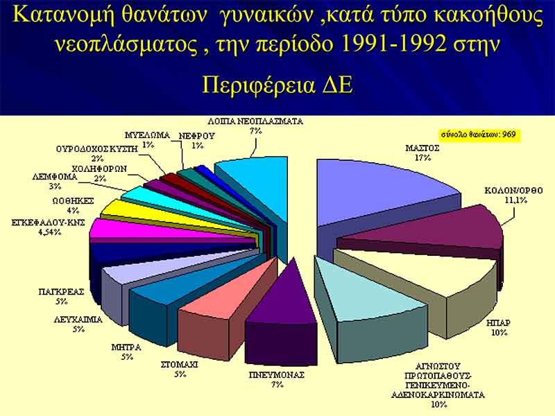 8. Ένα άλλο στοιχείο που χρήζει περαιτέρω διερεύνησης είναι ότι η επιμέρους διάγνωση των νεοπλασιών διαφέρει ουσιαστικά σε ορισμένους καρκίνους όπως π.χ. ο καρκίνος του ήπατος αναφέρεται σαν δεύτερη αιτία θανάτου από καοήθη νεοπλασίες και στις δύο περιόδους, με μείωση από 11% σε 8% την δεύτερη περίοδο. Πιστεύουμε ότι το παραπάνω στοιχείο μπορεί να οφείλεται α)στην διαφοροποίηση του θεράποντος ιατρού από τον ιατρό που εξέδωσε το Πιστοποιητικό Θανάτου, β) στην μικρότερη εμπειρία του θεράποντος ιατρού ως προς την διαφορική διάγνωση πρωτοπαθούς ή δευτεροπαθούς νεοπλασίας ήπατος δεδομένης της έλλειψης ανάπτυξης πλήρων δομών Κλινικής Ογκολογίας στην περιφέρεια Δυτικής Ελλάδος, γ)άλλες αιτίες υπό συζήτηση